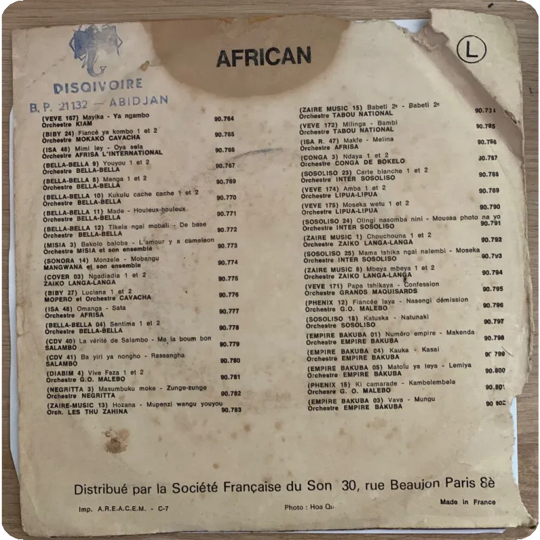 Northern Benin soukous / rumba double sider rarity, sleeve has aging & dirt, narrow bites on bottom spine & mouth, ringwear, beige stains, record has a few clicks on intro to A side otherwise only light to hardly noticeable noise.