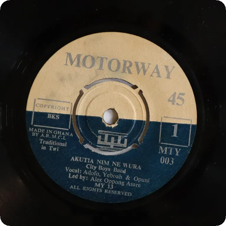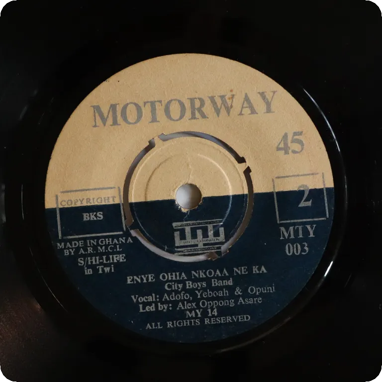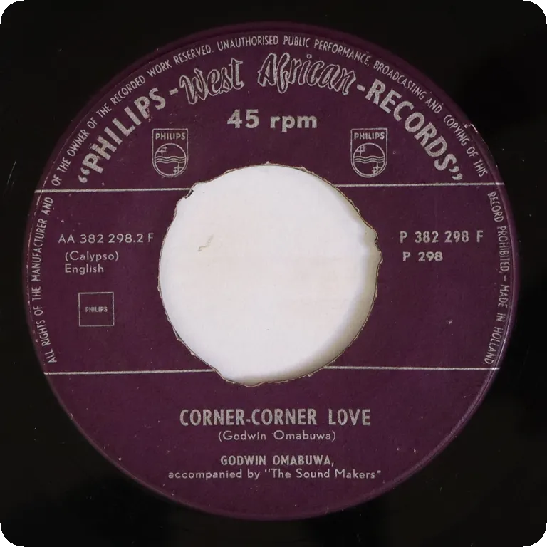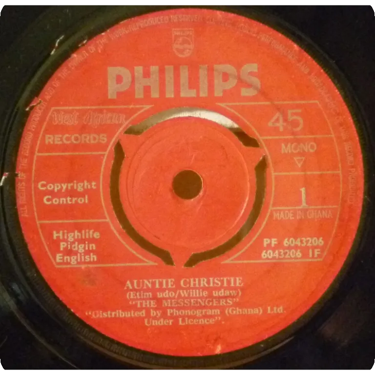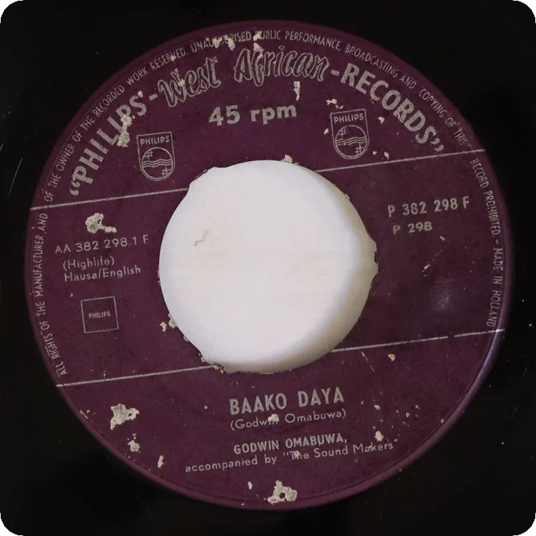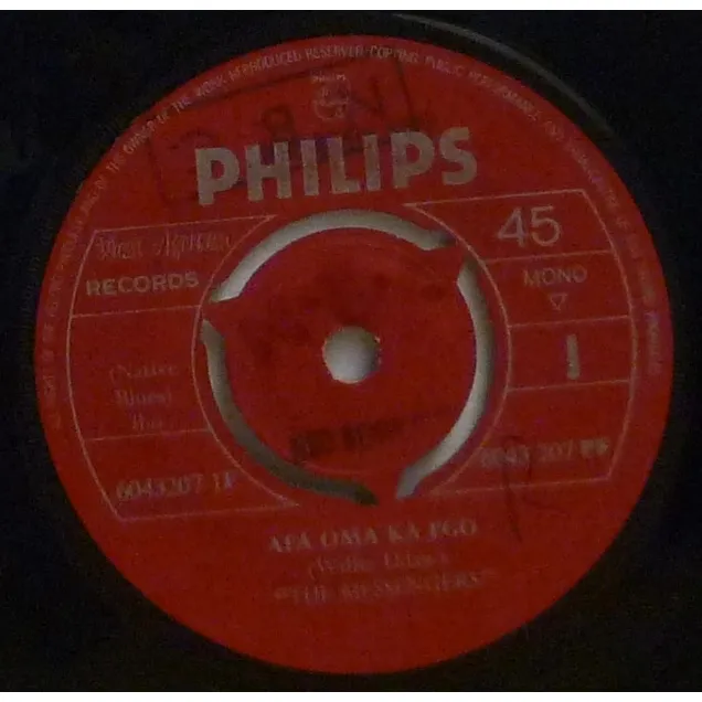Excellent and ungoogleable Nigerian highlife single only winner, solid horn work, trumpet & saxophone, in a very 60's vein. Writings & rubber stamps on labels. Record is G to VG, cracked on half radius but still only plays with very reasonable to very light noise.