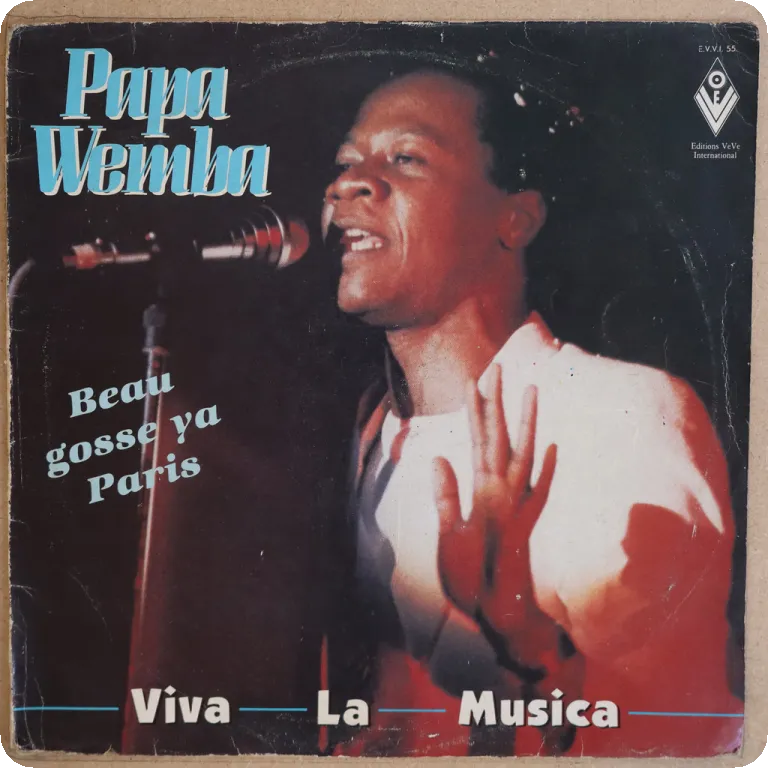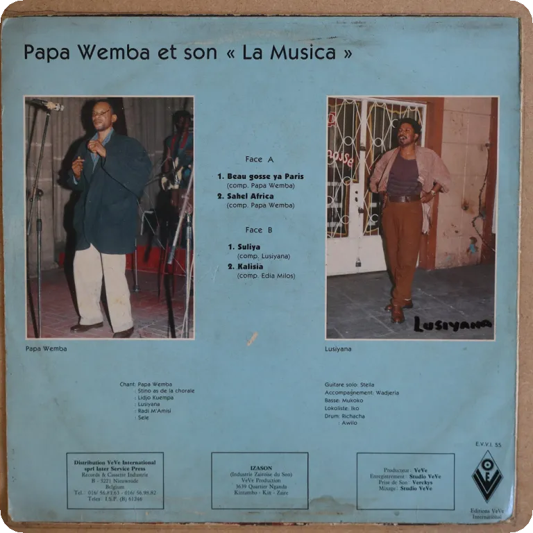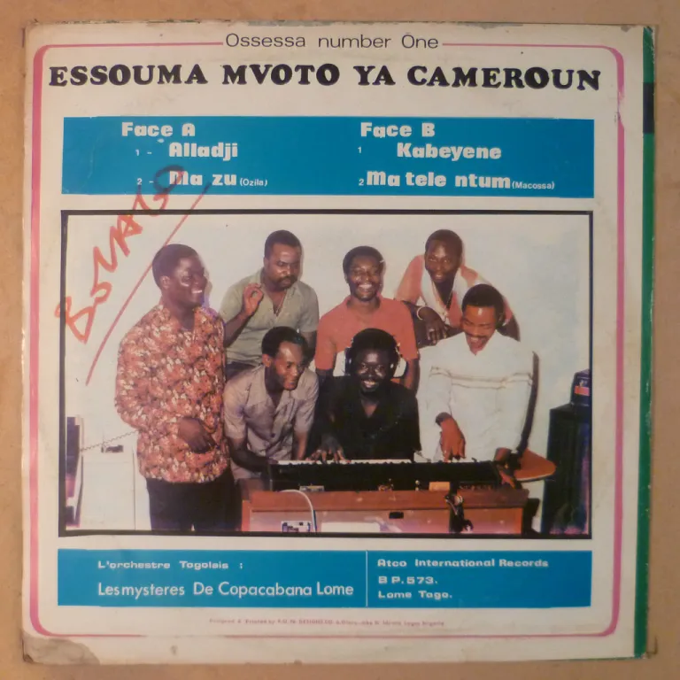 Tropical dancefloor soukous winner at title tune and a hypnotic rumba on this scarce afro pop LP recorded in Togo by Cameroon singer, backing by obscure Mysteres de Copacabana group, sleeve has some aging & dirt, lightly visible beige water damage & some peel off on front, writings on cover & labels, record plays w/ pressing hiss though in shape.