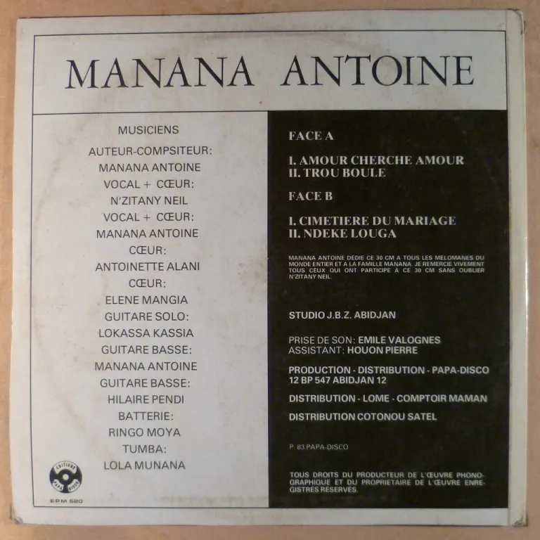 Sweet laid back afro latin tune & 2 soukous tracks on this Ivory Coast release, sleeve has some wear, ringwear, dirt on back, writings on back & labels, record plays with light to hardly noticeable