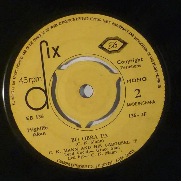 Single only highlife double sider early recordings by this Ghana artist with multiple hits in the 70's. Sleeve has aging & dirt, creases, mini bites along mouth. Fading of the text, writings on labels