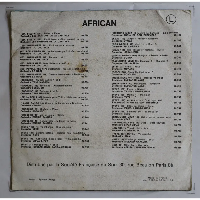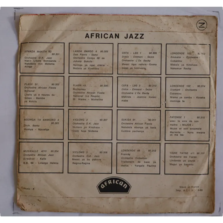 Single only Congo rumba double sider rarity by one of Congo leading 60's groups. Never shows up ! Some wear & creases on cover, rubber stamps & writings on back & B label, writing on A label, record