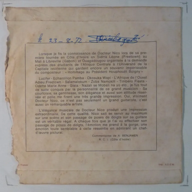 A deep bolero sung in both French & lingala & a rumba on this scrace release by the Congo guitar legend and his group. Sleeve has aging & dirt, peel off on front, writings on cover & labels, record