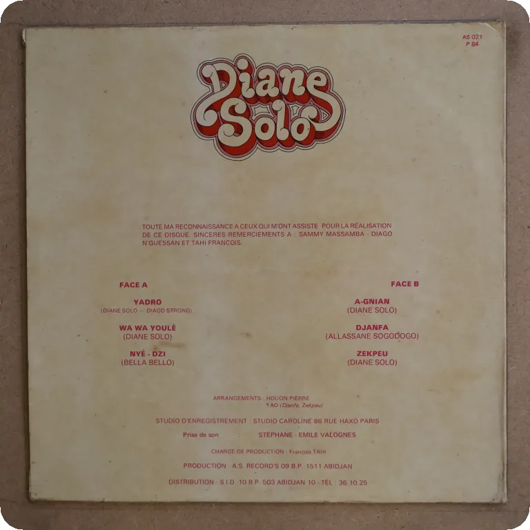 A manding pop ballad & 2 afro pop tunes along with 2 soul ballads on this much scarcer LP by the Ivory Coast singer in nice shape. Sleeve in nice shape but dirt wear on cover & labels. Record in great
