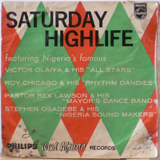 Nigeria 60's Highlife winners by Osadebe, Rex Lawson, Victor Olaiya & Roy Chicago. Sleeve has strong aging & dirt wear, much peel off & rubber stamps on back, stickers on labels, strong discolouration of the text on B side label, record plays w/ reasonable constant noise from unremoveable dirt