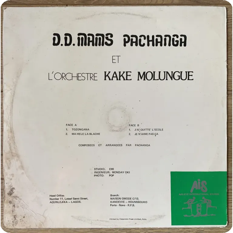 Solid soukous recorded in Nigeria by this obscure group led by Benin based bass player DD Mms Pachanga. Sleeve has crackling & peel off on bottom mouth corner, record plays sweetly, minor sound