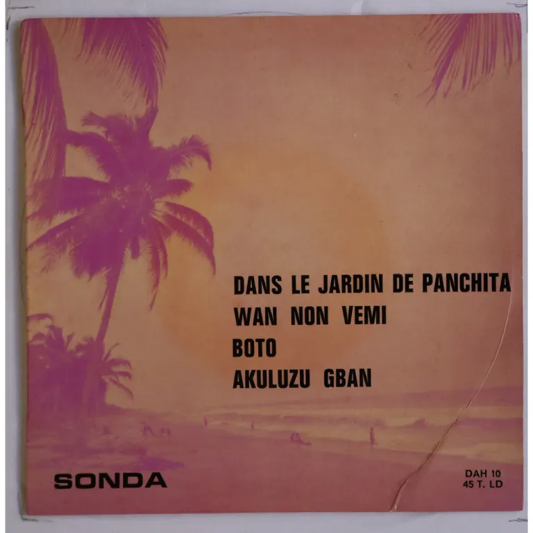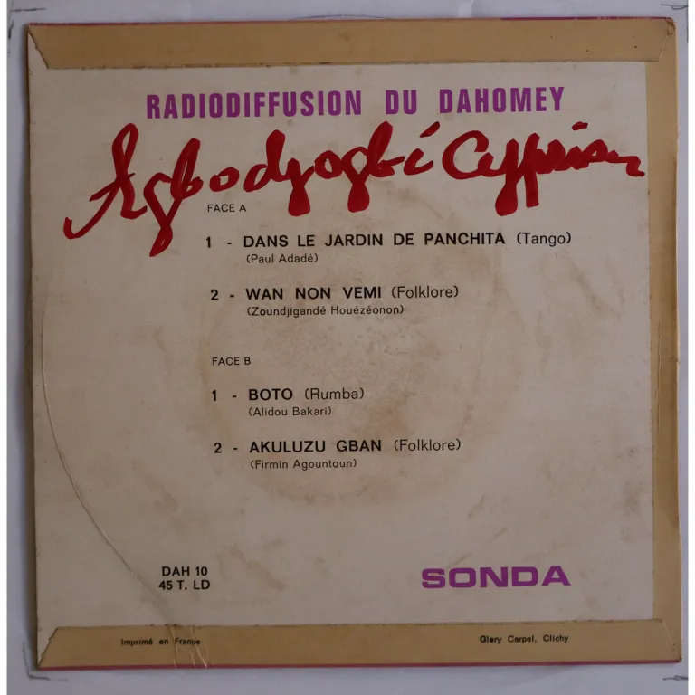 Early Beninese recordings, features a rumba by Alidou Bakari (later from Super Borgou), also includes 2 foklore tunes and a lovely tango sung in French. Sleeve has light dirt wear & aging, creas, large writings on back, writings on labels, record has light to hardly noticeable noise w/ light marks & cheap press.