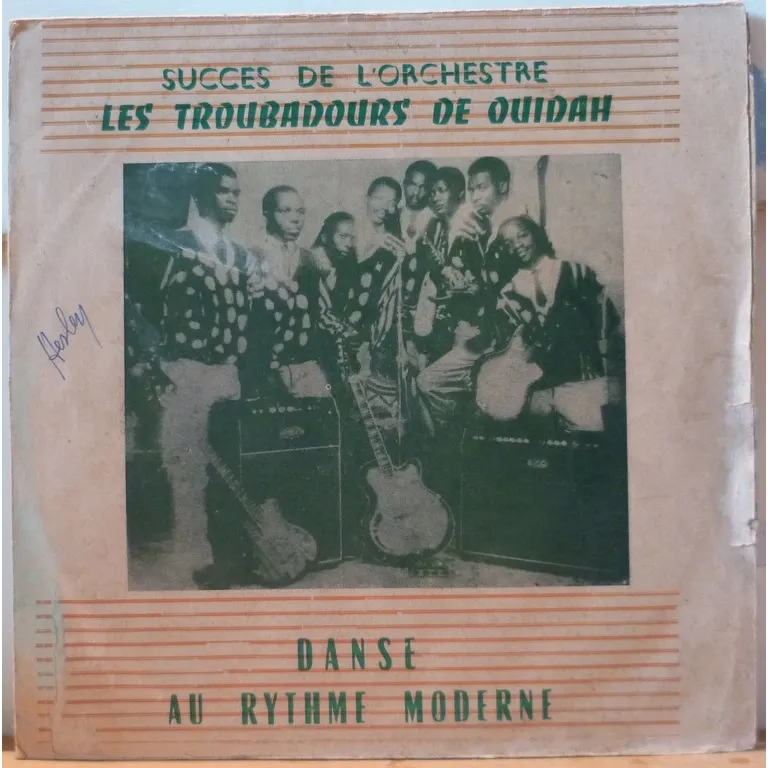 Ultra rare self produced modern Beninese music LP by this lesser known group. Sleeve is w/ aging & dirt, writings on front & B side label, rubber stamp on back, mini tears on mouth. Record plays VG-- to VG++ with light occasional noise from thin marks, note some tunes are noisy from mastering as this record apparently compiles previously released ultra rare material and mashed vinyls have been used to master for the comp' (as can be noticed on clip 3).