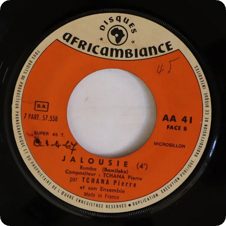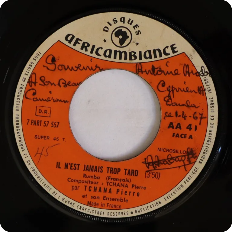 2 rumbas recorded by this renowned Cameroon singer / songwriter for this ultra rare single only release. Writings on labels, record has marks & constant light to very light noise from marks.