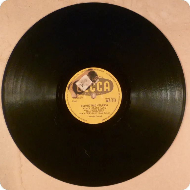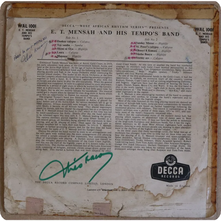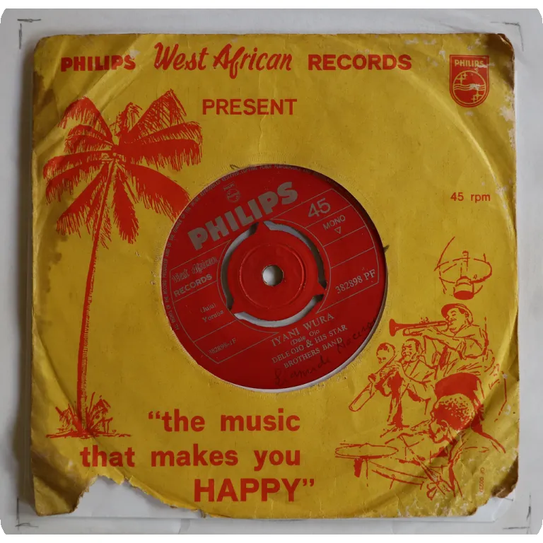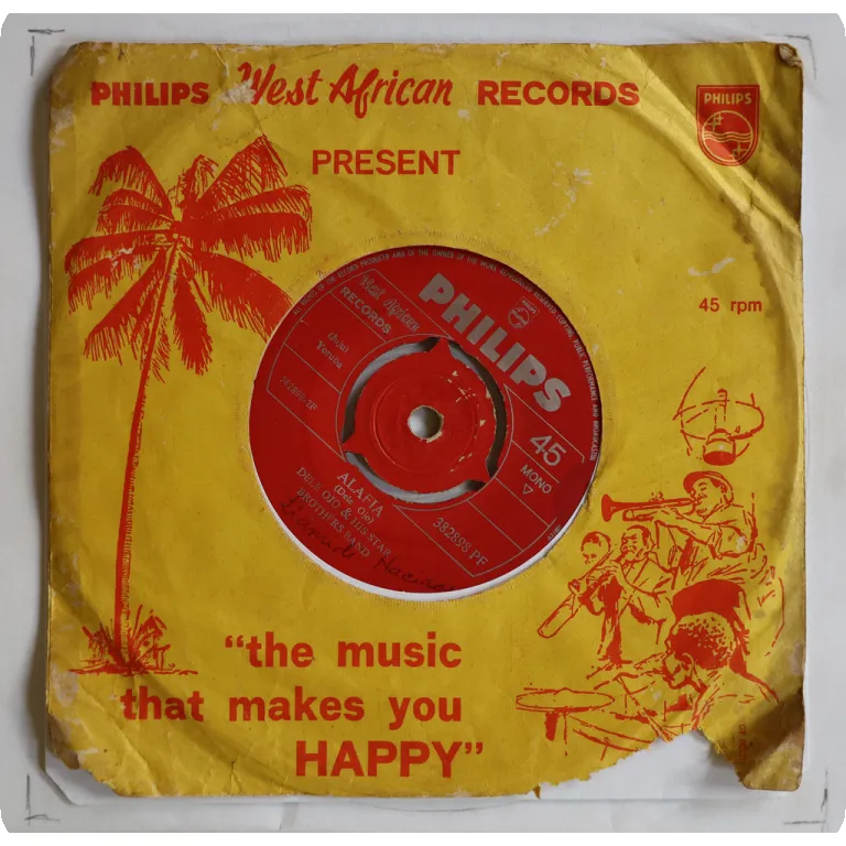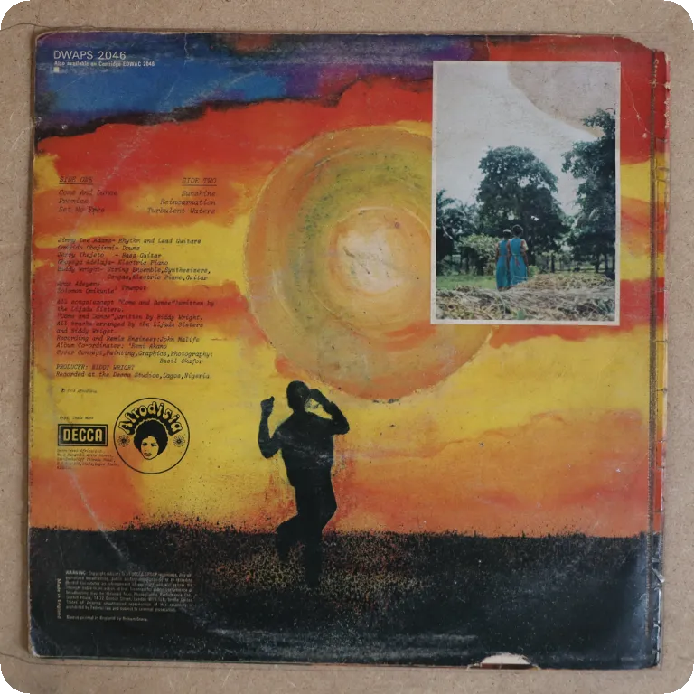 Ungoogleable highlife tracks recorded by Nigerian artist and sung in Efik language. Sleeve is F has dirt, creases, small writings, bite on one of the bottom seam corners, dark brown water damage stain, bite on one of the mouth corner, small holes, writings on labels, some small peel off on B label. Record is V- w/ pressing noise & marks, some clicks from deeper marks, still quite an enjoyable copy