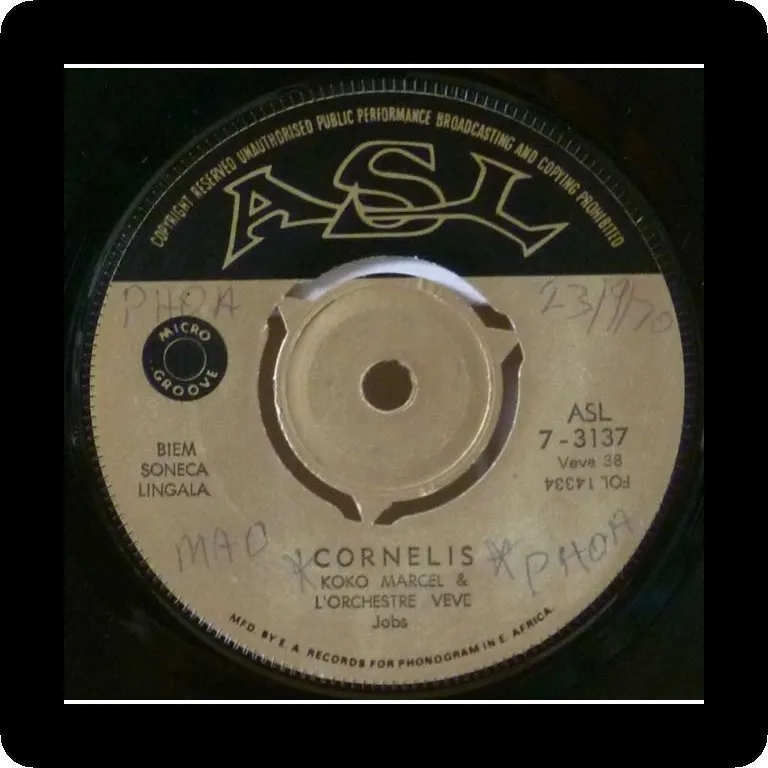 Congolese rumba double sider on top as recorded by the saxophone legend with his group. Writings on labels. Record plays solid VG- to VG, w/ minor light noise only despite surface marks.