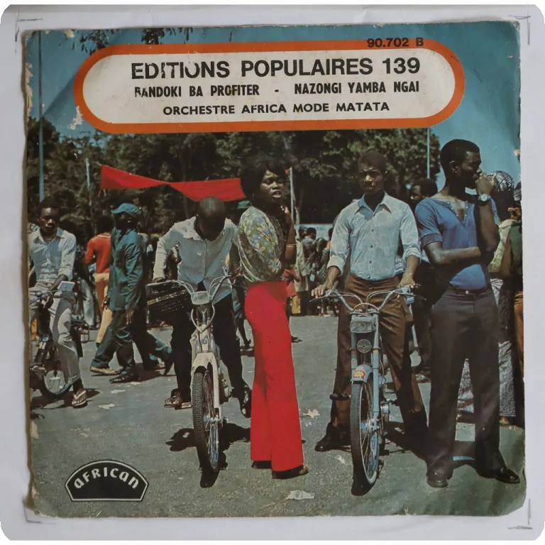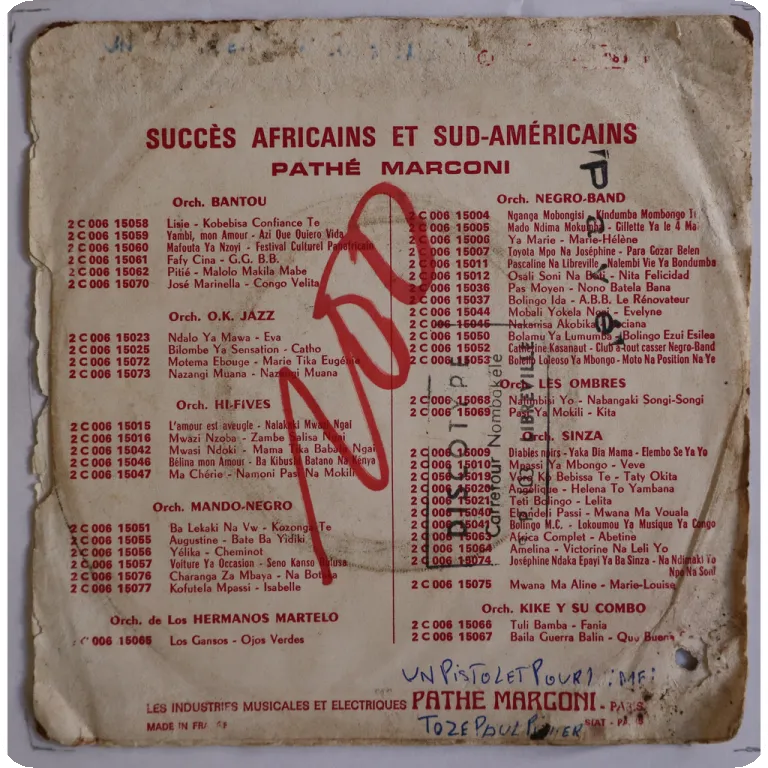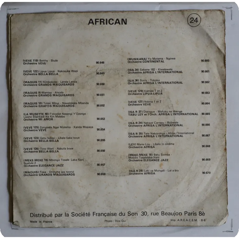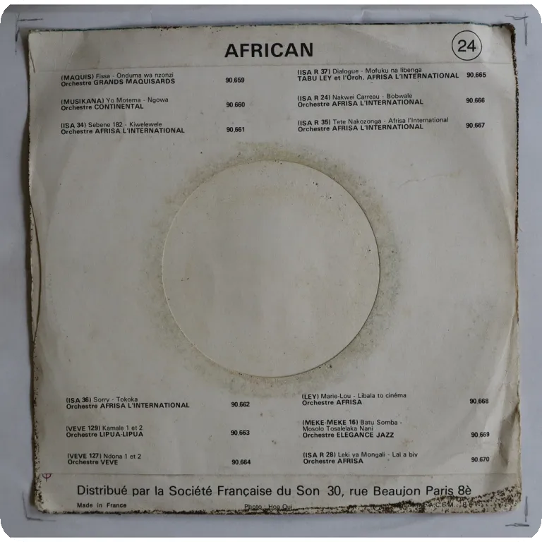 2 heavy soukous dancefloor parts 2 on this scarce 12" double sider recorded in Congo Brazzaville. Dirt wear & aging on cover, mini bite on bottom mouth, 5" split on spine, record has marks but plays nicely.
