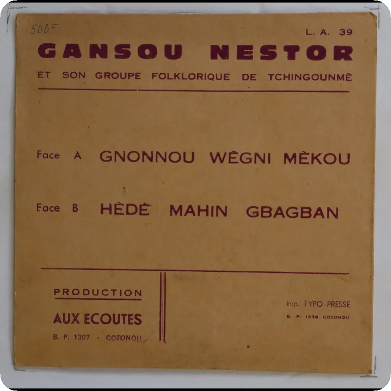 Deep percussion, voice & handclaps rarity by one of Benin's elading figures of the genre, minor wear on cover, dirt on labels, record has constant strong noise from numerous marks.
