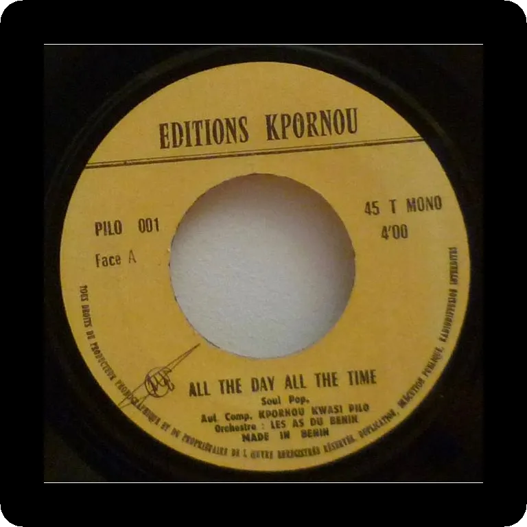 A highlife and an afropop on this mega rare privately produced Benin release. Brown stains on labels. Record is VG- w/ cosntant light noise from marks
