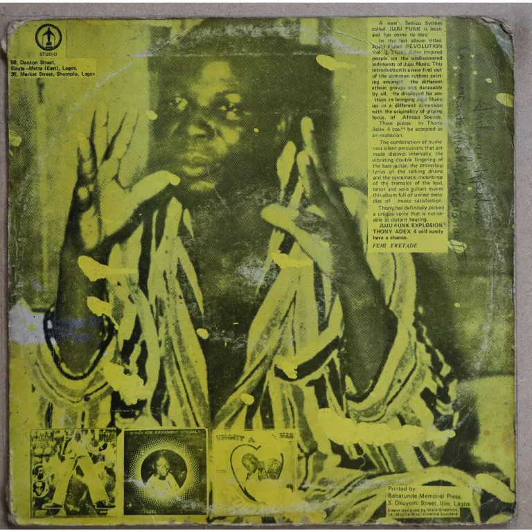 Deep Juju psychedelia sung in Yoruba. Sleeve has aging & dirt wear, large peel off & light brown water damage wear along mouth, small writings on labels, record plays quite well despite surface marks