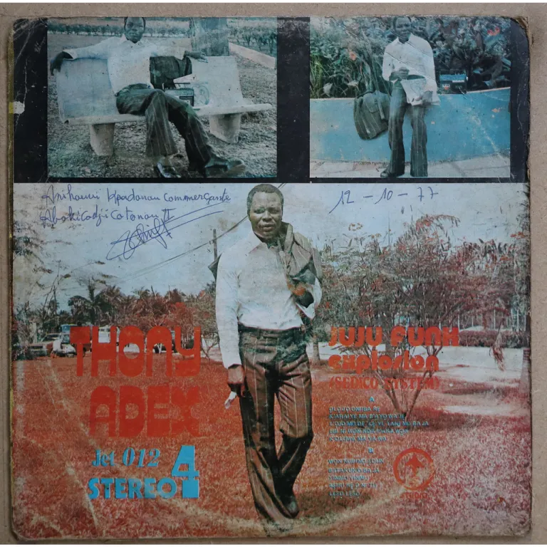 Afrobeatish parts on this juju music medley lp by one of Nigeria's 1970'smodernizers of the genre. Sleeve has aging & dirt, writings on front & labels, record has quite reasonable noise edges up to hardly noticeable noise most of the time, ranging from VG- to VG+