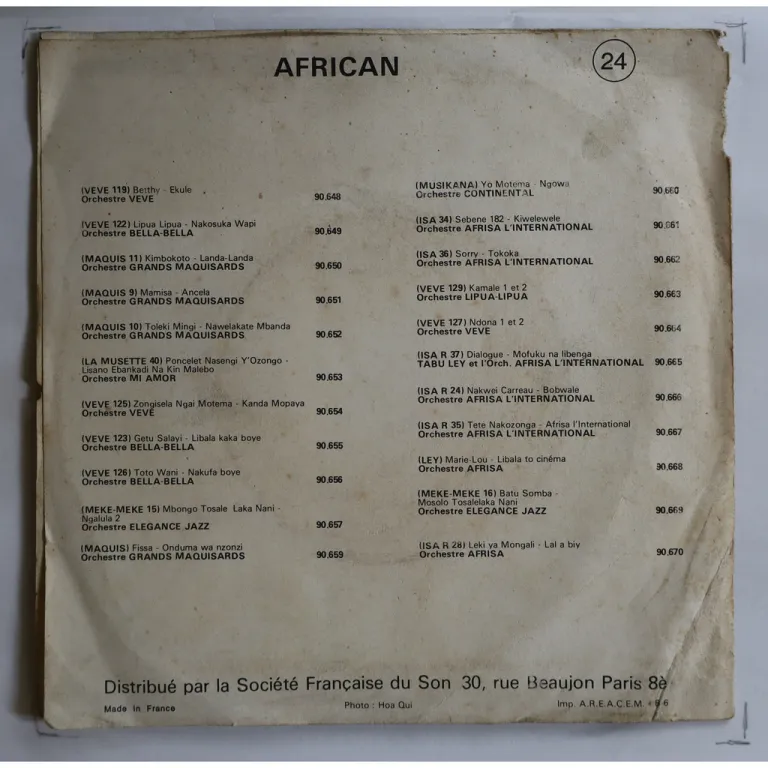 2 raw rumbas w/ funky soukous & powerfull horn section at the end of each track. Some aging, narrow bite on top spine, creases, dirt wear on back, record has some inaudible warp, light to hardly noticeable noise.