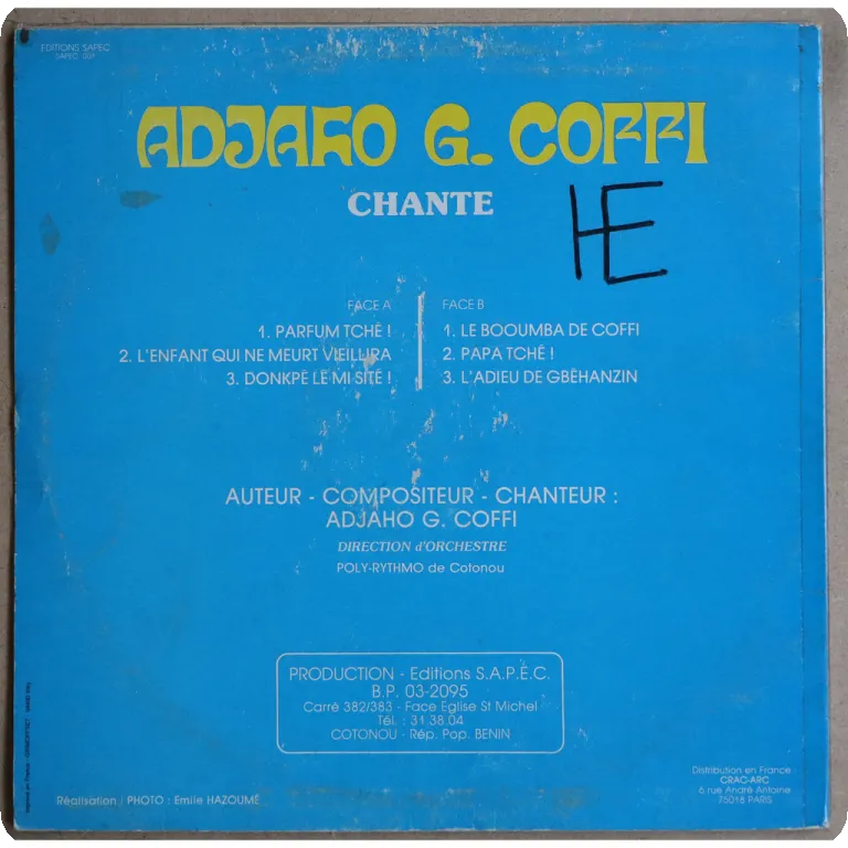 Deep, hybrid syncopated afro pop & afrosynth mellowness w/ clear voudoun influence w/ backing by the kings of Benin, sleeve has light wear, faint writing residue on front, writings, light brown stains