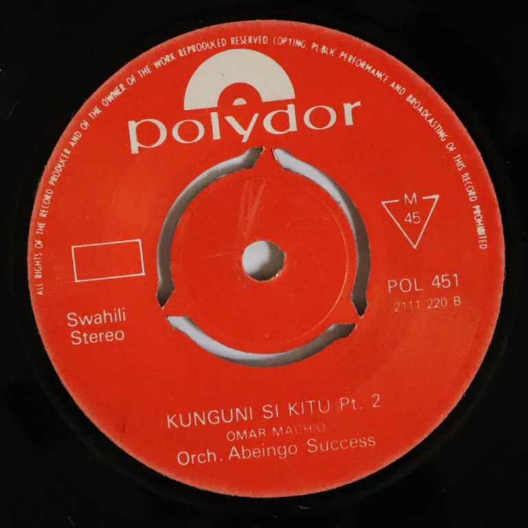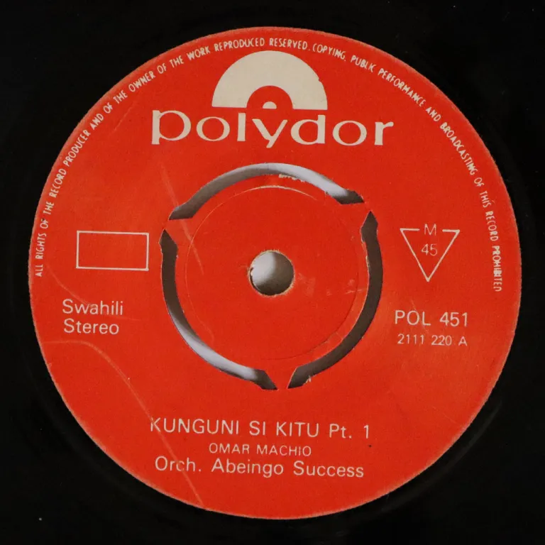 Ungoogleable Kenya or Tanzania swinging soukous winner tune sung in swahili. Wear & paper stuck on labels & large peel off & dirt on B side label, record has marks, noise in parts, particularly on B