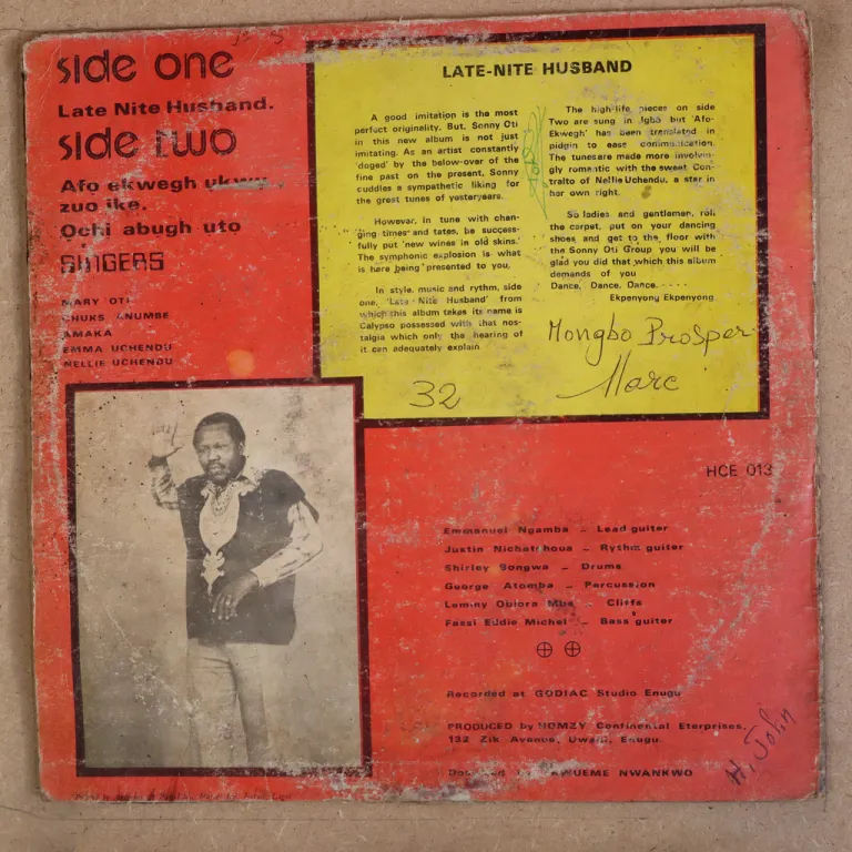 Nigerian Ibo highlife on top. Sleeve has some light wear, ringwear, dirt. Writings on A side label. Record has constant noise from pressing & surface marks.