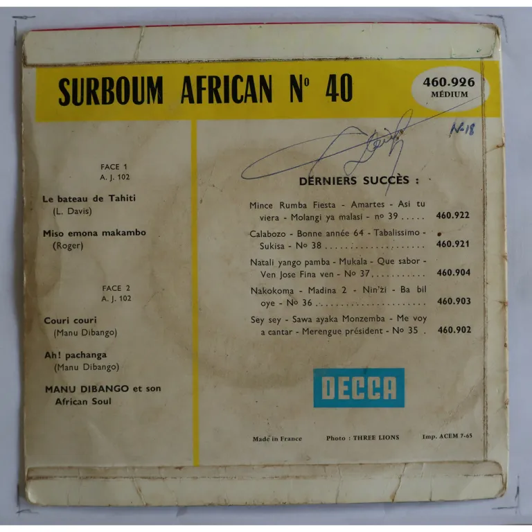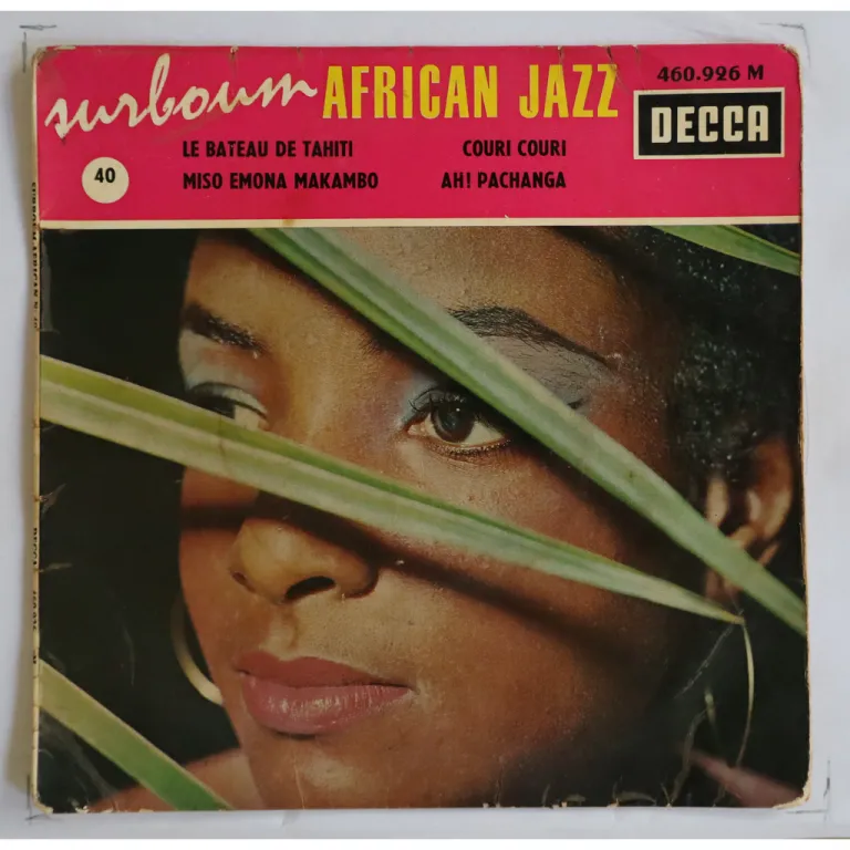 Killer deep bolero & a Cuban influenced cha cha cha + 2 rumbas on this scarce EP taken from the Surboum African jazz catalogue. Sleeve has aging & dirt, small bite on top mouth, writings & ringwear on