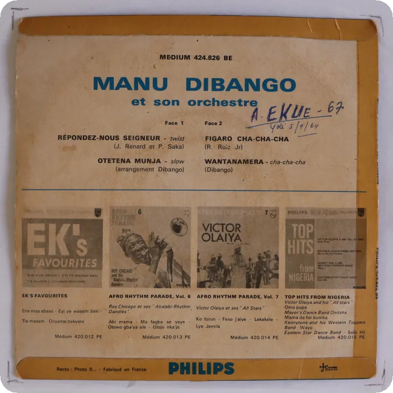 A hard hitting cha cha cha Congolese style & a rumba on this scarce OK Jazz release. Sleeve has strong wear, writings on back, peel off on front, bite on top mouth corner, record plays VG- to VG w/