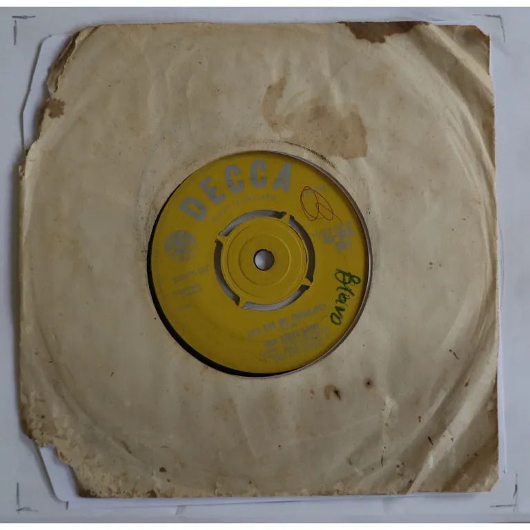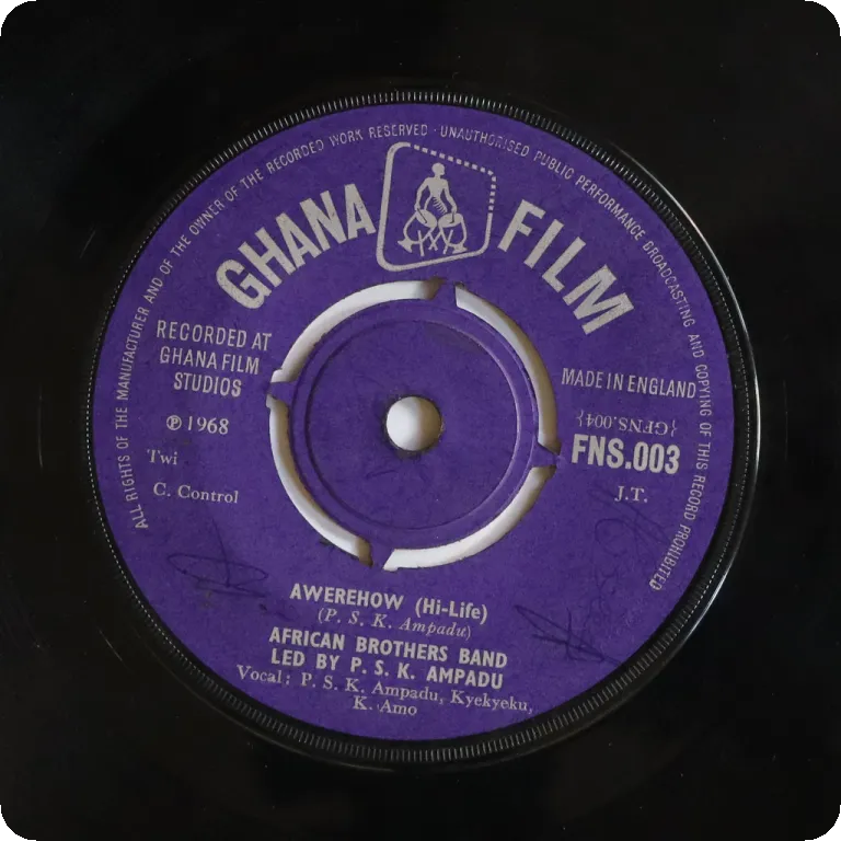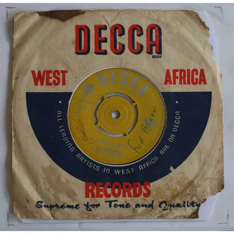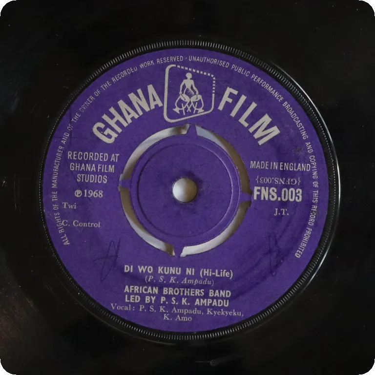 Ultra rare early recordings by this much lesser known Ghana trumpet highlife band active in the 50's and early 60's. later compiled on their impossible to find 10" LP. Sleeve shas strong dirt & aging, large bites on on edge, beige & dark brown liquid damage stains Writings on labels. Record has marks a constant very reasonable to light noise.