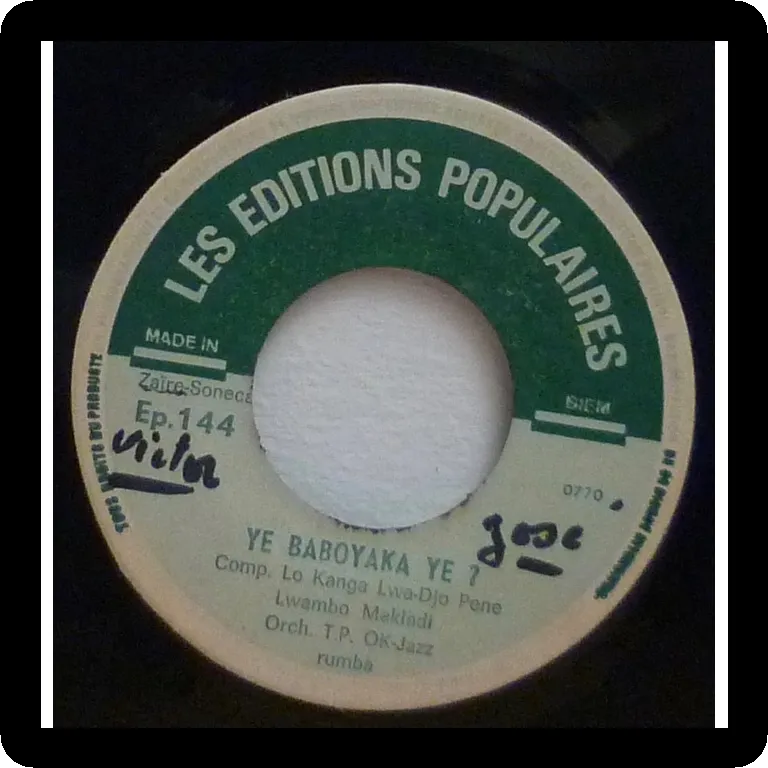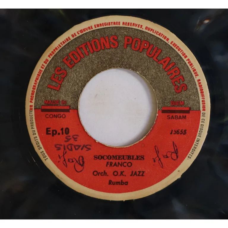 Ultra rare single only rumba soukous double sider by Congo's legends, including a tune advertising a furniture store, blue translucent vinyl pressing, writings on labels, record has constant reasonable pressing hiss.