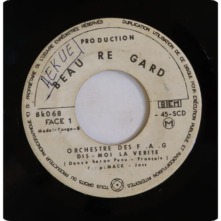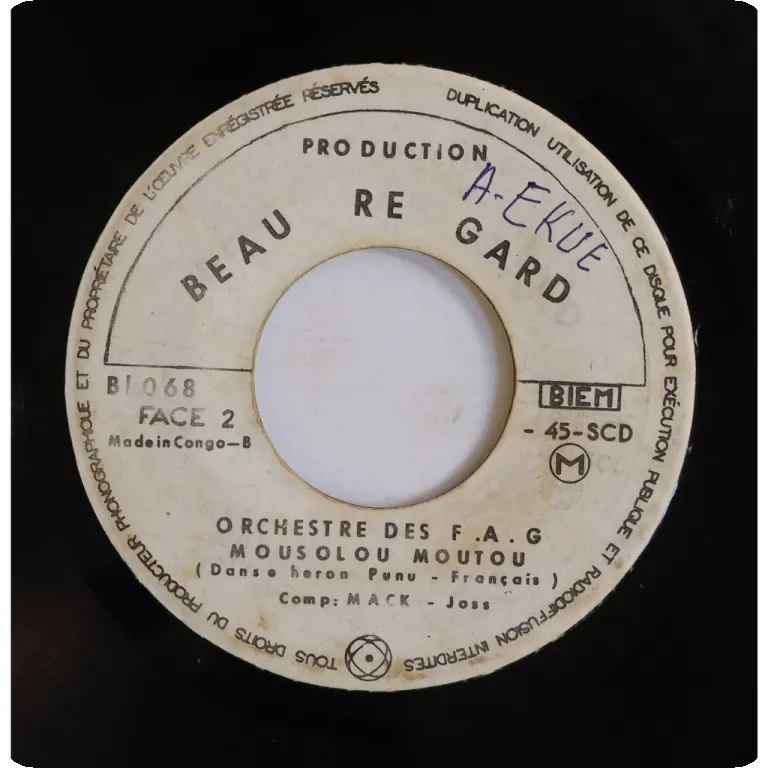 Rumba double sider composed by Moutouari Come and surely a super rare title in this Congolese group's discography. Stickers & writings on labels, record plays with strong to reasonable noise & occasional clicks from numerous marks.