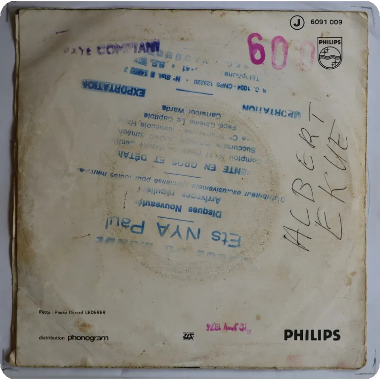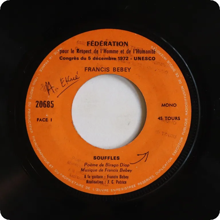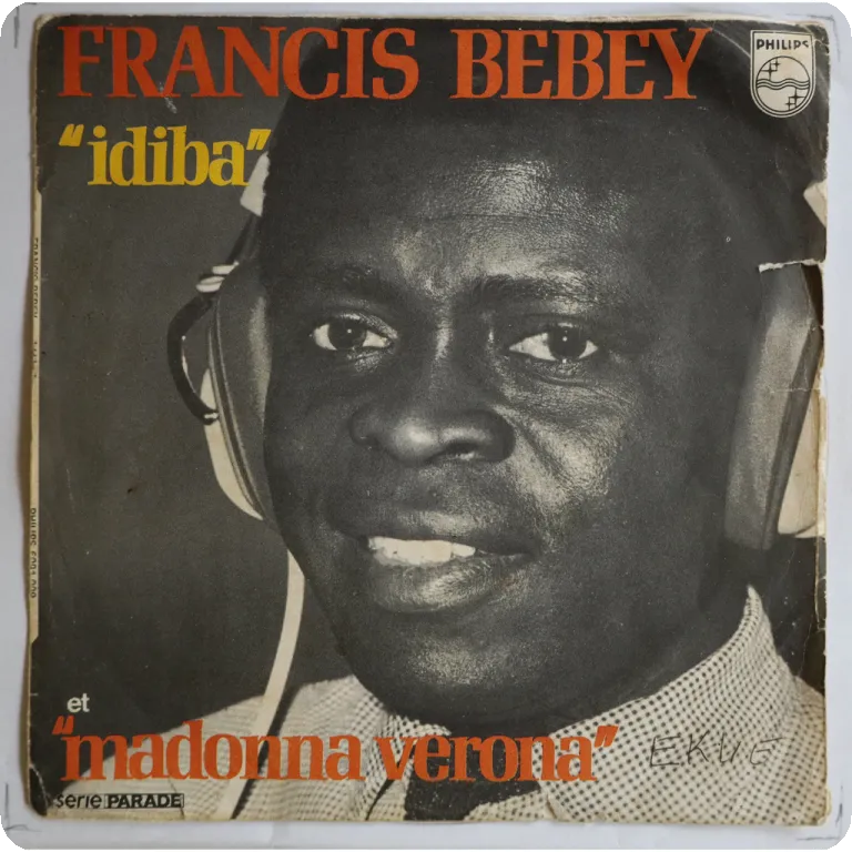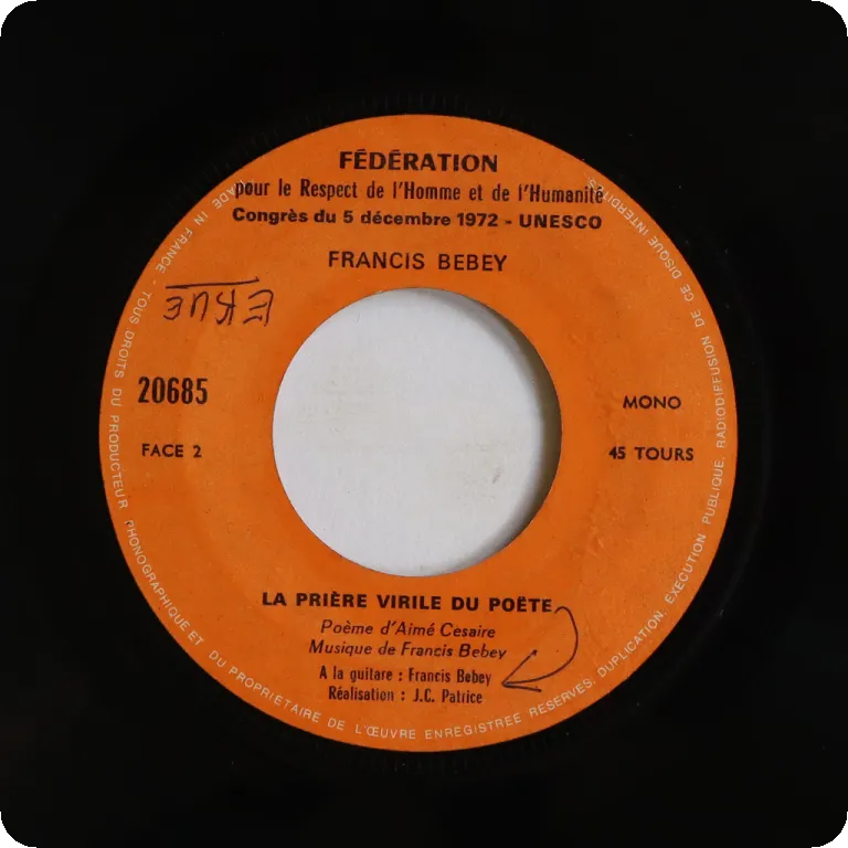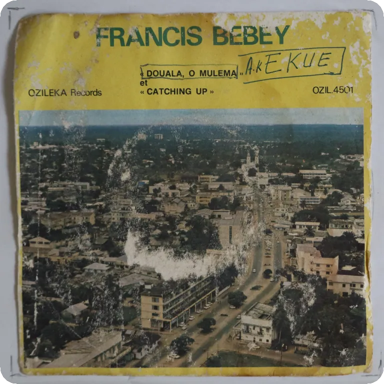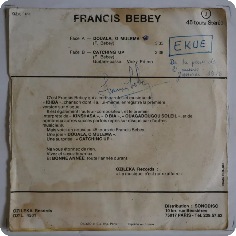 Scarce single only afro folk by the Cameroon legend. Sleeve has aging & dirt, mini bite on bottom mouth, rubber stamp on front & labels, writing & peel off on front, writing on label, record has reasonable to light noise from marks.
