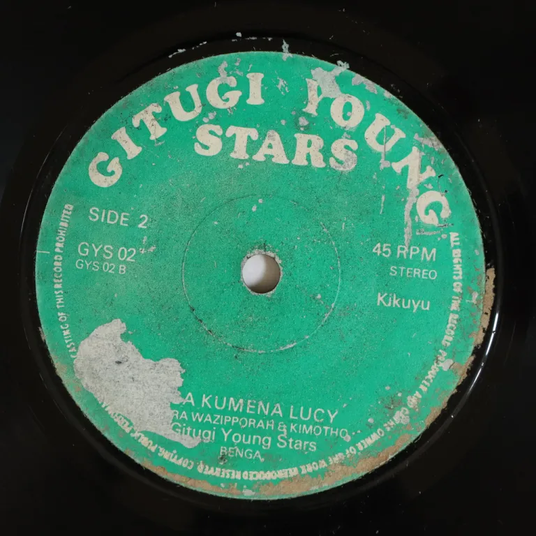 Ungoogleable rocky Kenya benga rarity sung in Kikuyu language by the sought after group, with a nice kick off on last part to both sides. Strong wear & peel off on labels. Record is solid VG- to VG+