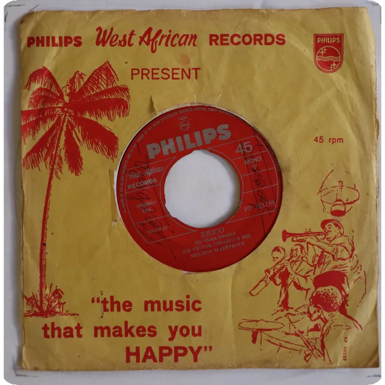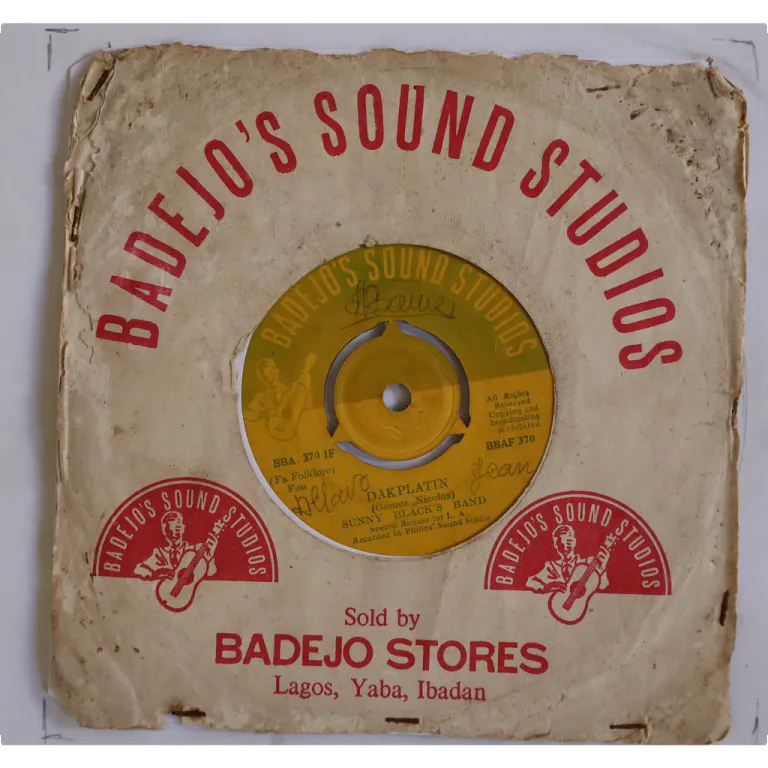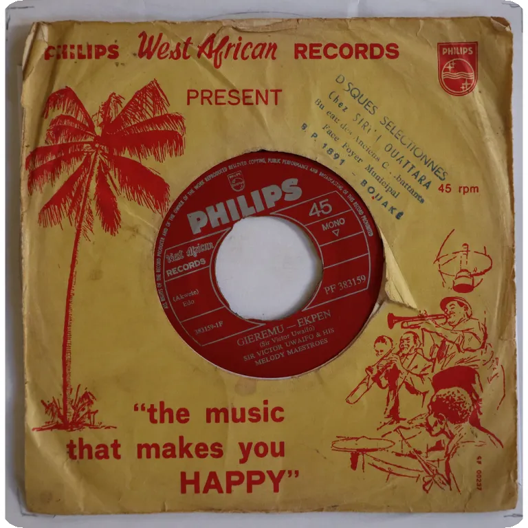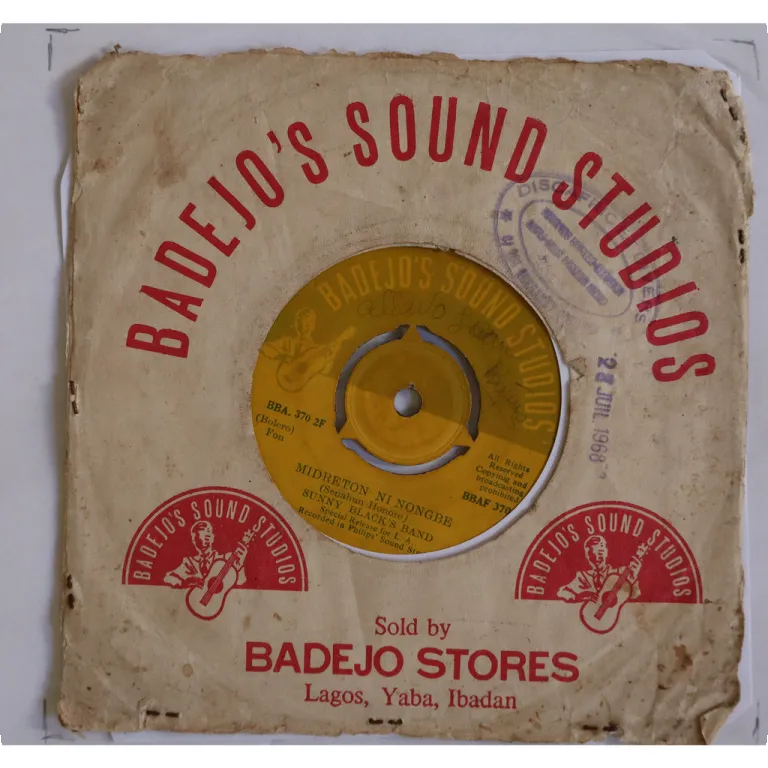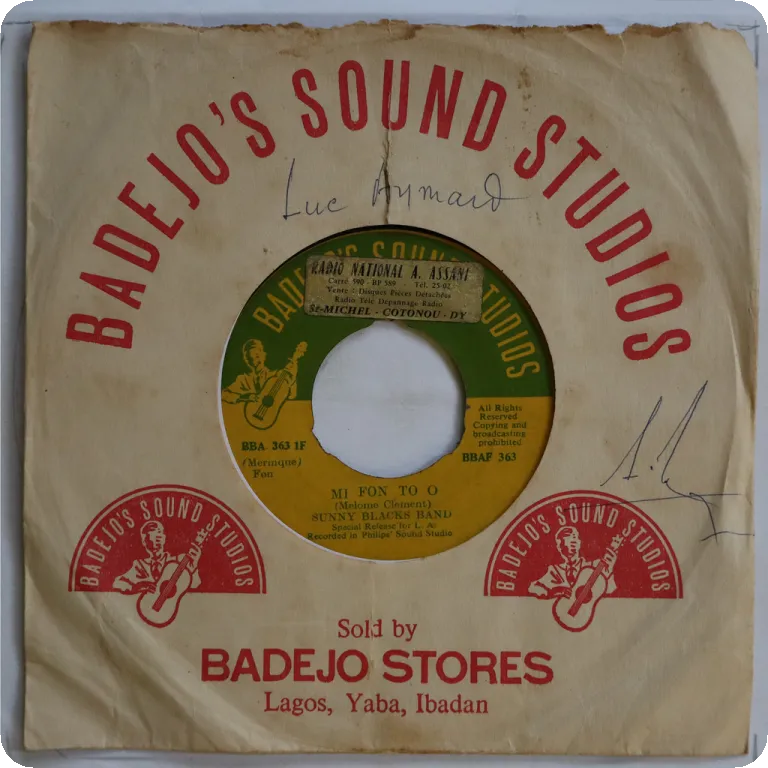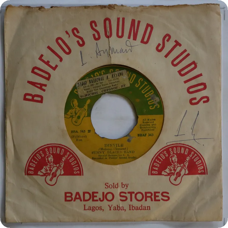 A highlife and a bolero on this ultra rare release by the band which would later become Orchestre Poly Rythmo. Sleeve has aging & dirt, shop stamp, 2" split on side edges, tear on center hole, writings on cover & B label, dirt on labels, record has light to hardly noticeable noise, nice copy.