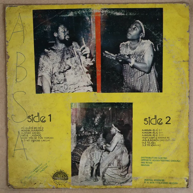 Deep yoruba juju one side long medleys with large female vocal group. Strong aging & dirt on cover, small peel off along mouth, creases, writings on cover & labels. Record has cosntant reasonable to very light noise from marks, VG- to very solid VG-/VG depending on parts.