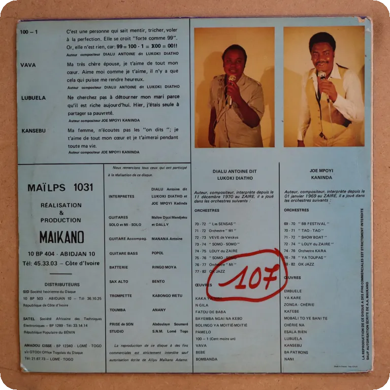 Tropical dancefloor soukous wonder lp recorded by Sam Mangwana's drummer with African all stars, Dally Kimoko, Assi Kapela, Joe Mpoyi, etc. Sleeve has aging & dirt, peel off on front, ringwear on back, writings on A label. Light noise in parts only despite multiple marks.