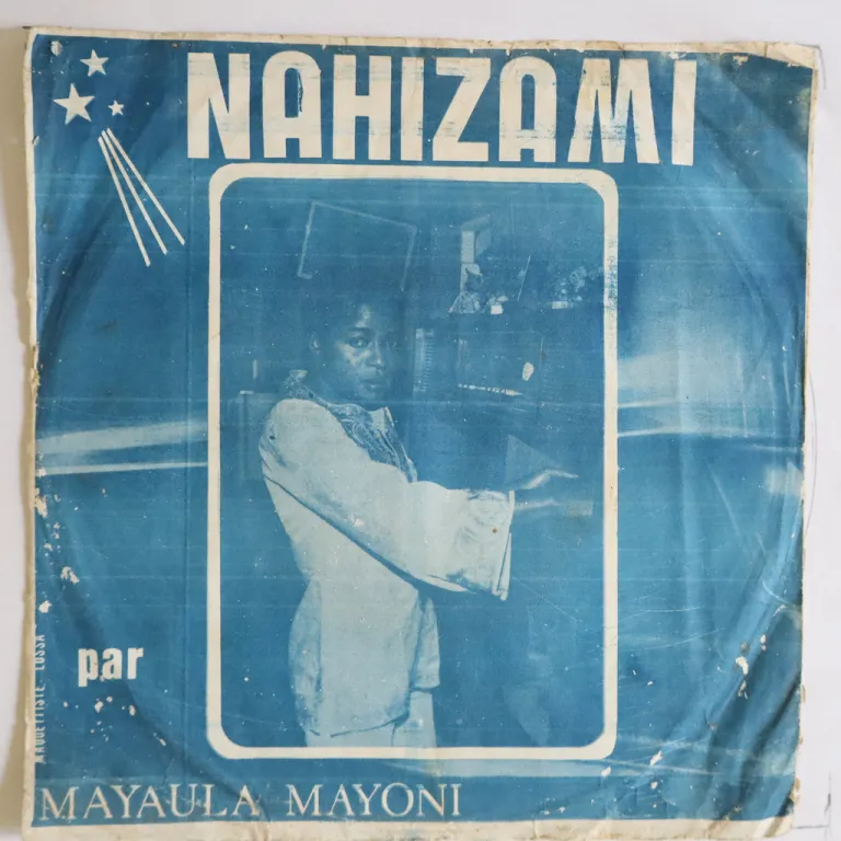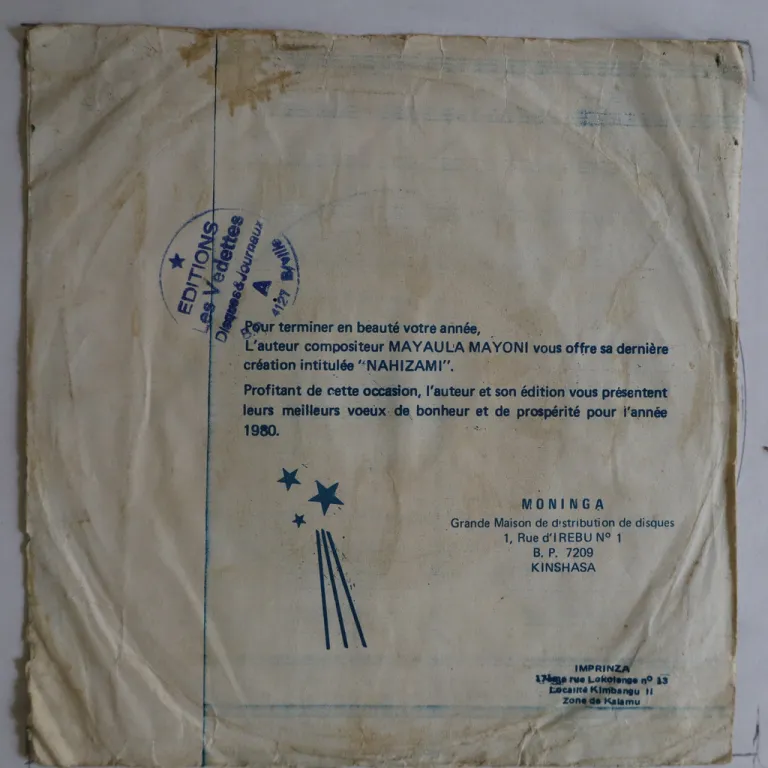 Congo soukous on top as recorded by one of the genre's leading 70's figure on this hard to find 7" single. Sleeve is VG w/ aging, dirt wear, light brown stain on back, creases, shop stamp on back & A side label, dirt on labels. Record is VG to VG+, light to hardly audible noise from light marks