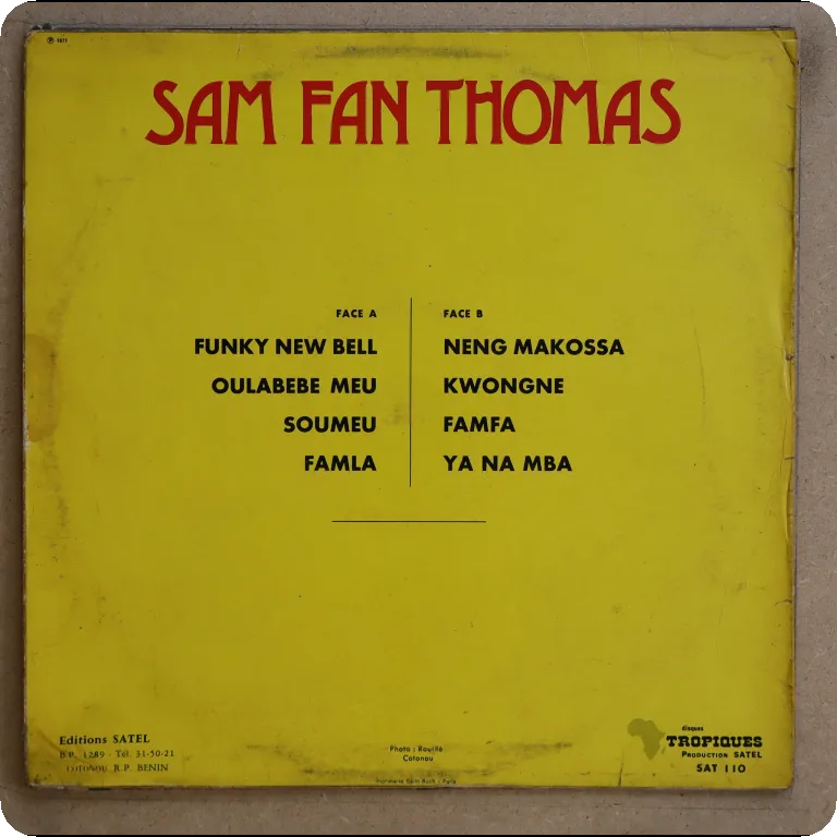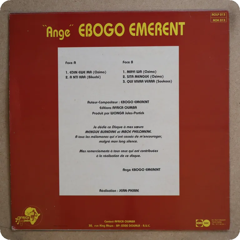 Afro funk hybrid makossa & hypnotic afro on this otherwise makossa debut LP by the famous Cameroon artist. Sleeve has aging & dirt, creases, few small peel off, few tears on mouth on front, small bite