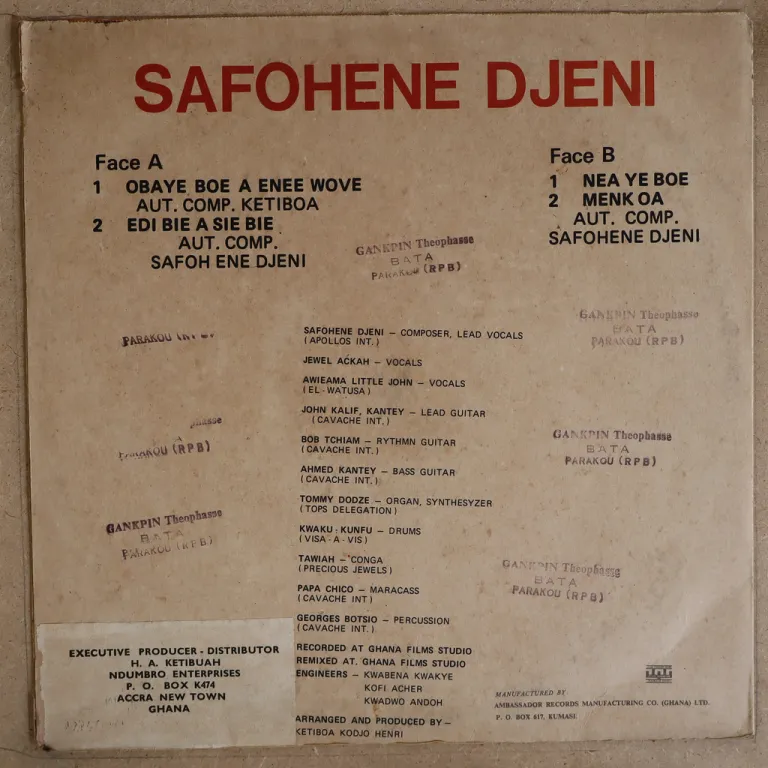 Dancefloor winner funky highlife & highlife soukous hybrid winners on this Ivory Coast/Ghana rarity. Sleeve has some aging & dirt wear, rubber stamps on cover & labels, dirt on labels, record plays with very light to hardly any noise despite marks, ranges from solid VG to VG++ depending on parts.