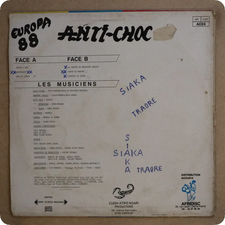Serious dancefloor soukous winners on this scarcer release by the Congolese dancefloor kings. Sleeve w/ strong ringwear, some creases, aging, shop sticker on front, writings on labels. Record has