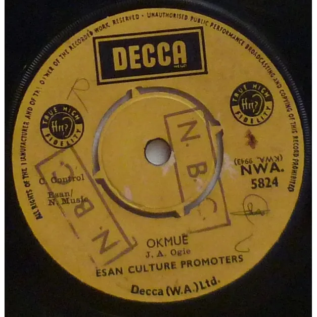 Nigerian Edo/esan language voice & percussion folk rarity. Rubber stamps, writings & light wear on labels. Record has very reasonable to light noise from marks.