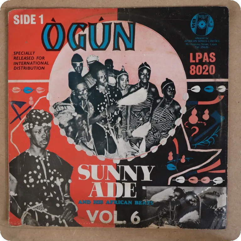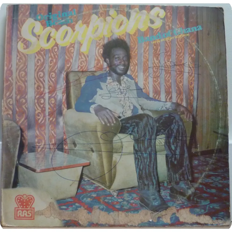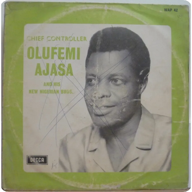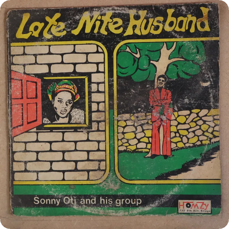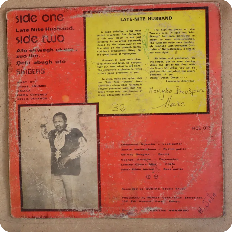 Consistent Nigerian ibo highlife rarity w/ down & uptempo tunes. Dirt & aging on cover, peel off & beige water damage, strong ringwear. Record has very reasonable to hardly noticeable noise from marks, solid VG- to VG/VG+.