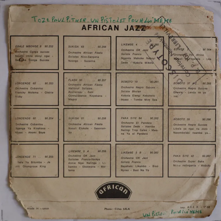 60's rumba single only rarity by one of the legendary Congolese orchestras, sleeve has strong wear, bites on spine & mouth, multiple small peel off, writings & rubber stamps on back & labels, writings on front, 5" split on spine, 1,5" split on bottom, record has marks & quite reasonable to light noise, VG- to very solid VG-