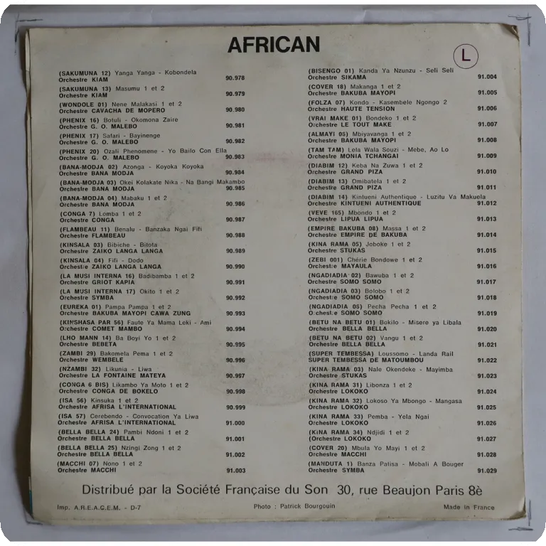 2 funky soukous winners recorded in the US by this lesser known Congolese singer. Sleeve has light aging & dirt, small peel off along spine on back. Record plays w/ minor backing noise.