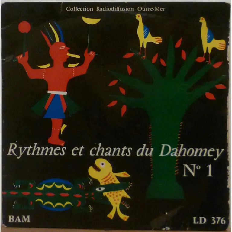 Benin / former Dahomey field recordings of folk music including kpete flute, drums, vocals, bells. Sleve has some aging & dirt, small peel off along mouth on front, record has reasonable constant noise but multiple clicks on A side (clip 3).