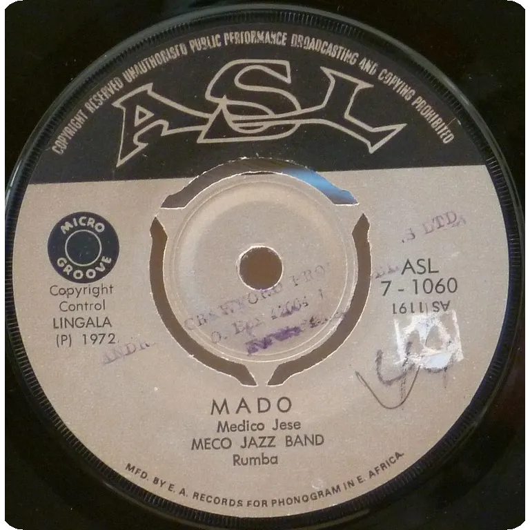 Kenyan production of Congolese rumbas. Peel off & writing on one label, rubber stamps residues on both labels. Record plays VG- to VG, reasonable to light noise & clicks from marks, several clicks at
