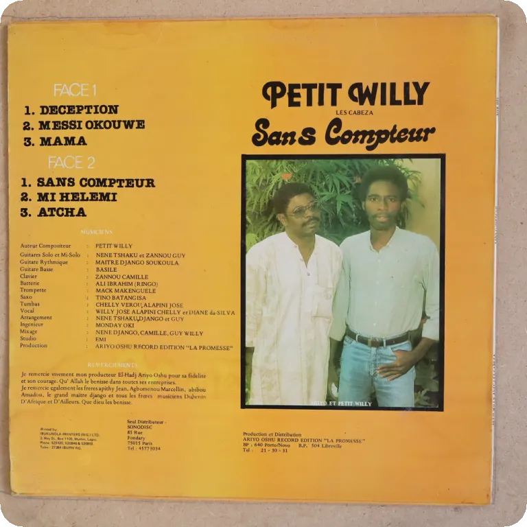 2 Tropical dancefloor uptempo soukous winners on this ultra rare Nigeria only Congolese soukous rarity. 2" wide vertical light beige water damage stripe along mouth, dirt wear, white discolouration stains on front, writings on labels, record has strong to hardly audible noise, worse part is first half of one of the standout tunes, B1, which has visible damage and only plays G there, otherwise ranges from solid VG- to solid VG