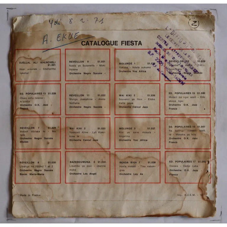 Killer hypnotic rumba w/ spoken word parts & more classic rumba on B side on this super scarce single only release. Still really off the radar, obviously too rare to buzz...until some vinyl ambassador puts it on the map ! Split on all edges, comes in two separate parts, strong dirt & aging, beige water amage, warp, peel off. Shop stamp on back. Writings on cover & labels. Plays w/ reasonable to light noise, solid G to very solid VG- depending on parts.