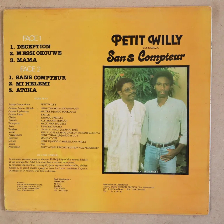 Ultra rare consistent soukous LP from Benin, 3 solid dancefloor part 2 for the Tropical deejays, light wear on cover, beige water damage on bottom mouth corner, dirt on labels, record has has light to no noise from marks, solid VG- to VG/VG+ depending on parts.
