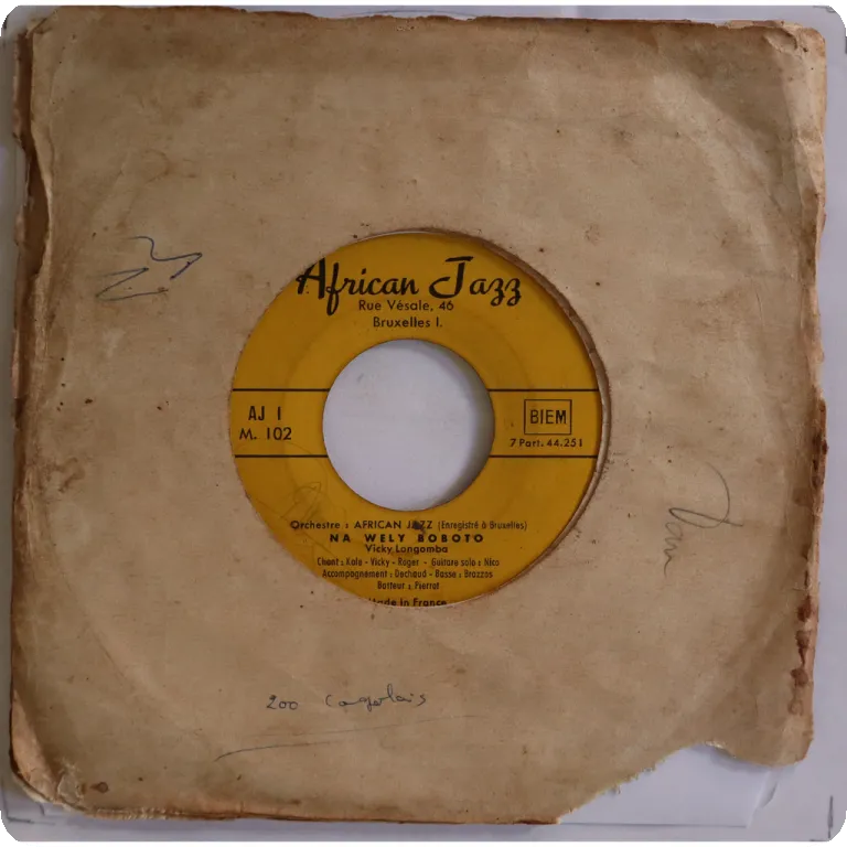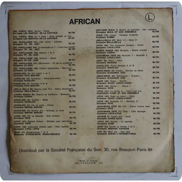 An uptempo single only dancefloor soukous winner by the Congolese legends. Strng wear & aging on cover, split on all spine, multiple small tears on spine, mouth & bottom, peel off on bottom front, reasonable to light noise from marks