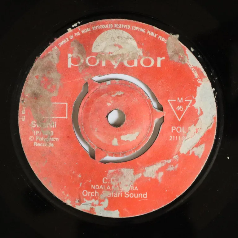 Single only soukous double sider winner sung in swahili by the successful Kenyan hotel band, hardly googleable. Strong wear & peel off on labels. Record is VG to VG+ w/ light to hardly noticeable noise from marks depending on parts