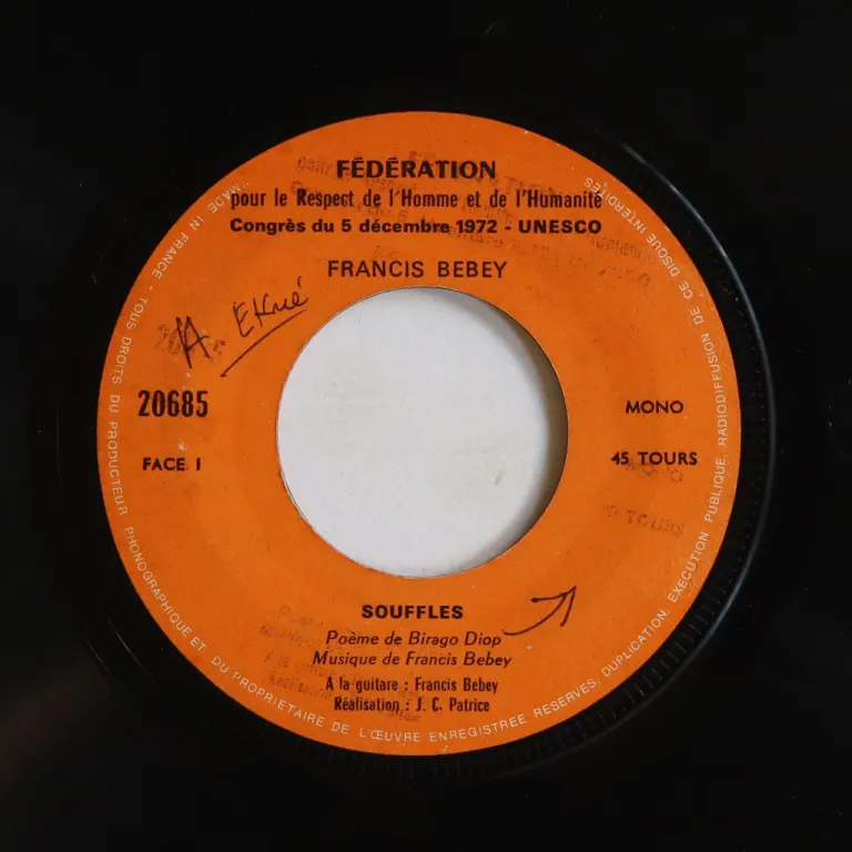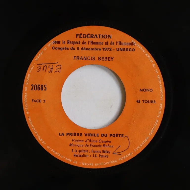 Ultra rare acoustic guitar folk single only double sider rarity by the Cameroon multinstrumentist. Writings on labels. Record has constant reasonable opaque pressing noise.